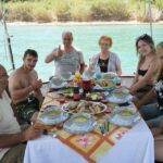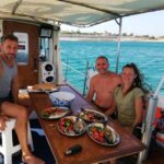 Once the catch is in, the skilled crew prepares a delicious meal, serving up either grilled fish or savory shrimp pasta, creating a feast from the day’s bounty. As guests savor their meals, they relish traditional Greek snacks and sip ouzo, seeing the local culture.