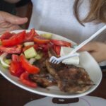 There are options for grilled pork, chicken, or vegetarian burgers. The meal also includes Greek salad, bread, seasonal fruit, and a soft drink or wine.