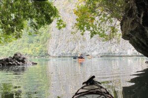 Next, the highlight is kayaking through the Bright Cave, which is a narrow, 100-meter-long limestone tunnel with an entrance about 4 meters wide. This natural wonder offers a unique experience of paddling through a glowing, cave-like environment—a favorite among travelers for its photogenic qualities.
