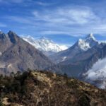 Trekkers often pause to capture these majestic moments through mountain photography, framing the snow-capped giants like Everest, Lhotse, Nuptse, and Ama Dablam against the clear blue skies.