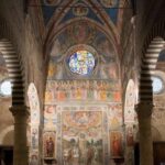 Upon crossing the threshold, you’ll immediately notice the impressive interior, characterized by 14 classical Tuscan stone columns—10 round and four octagonal—that support the vaulted ceiling. The walls are fully covered with frescoes depicting biblical stories, a visual storytelling method typical of the 14th century.