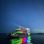 Towering limestone karsts rise dramatically from the emerald sea, creating a stunning backdrop for the evening. Iconic sights like the Bai Chay Bridge and Bai Tho Mountain come into view, each offering a glimpse into the region’s natural beauty and cultural significance.