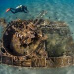 Located off the coast of Aqaba, Jordan, scuba divers can explore the stunning underwater world of the Red Sea, known for its vibrant coral reefs and intriguing artificial wrecks such as a C-130 Hercules transport aircraft and an anti-aircraft vehicle nicknamed “the tank”.